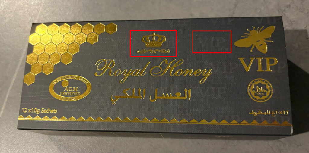 正規品にはロイヤルハニーのロゴの真上に王冠のマーク、「VIP」と書かれた透かし模様が刻印されています。